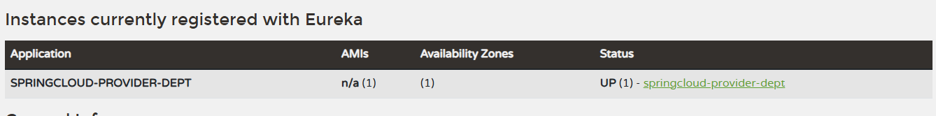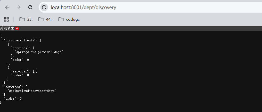 public Object discovery() {// 获取微服务列表的清单List<String> services = discoveryClient.getServices();System.out.println("discovery-->services:" + services);// 得到一个具体的微服务信息,通过具体的微服务id,applicationName;List<ServiceInstance> instances = discoveryClient.getInstances("SPRINGCLOUD-PROVIDER-DEPT");instances.forEach(instance -> {System.out.println(instance.getHost() + "\t"+ instance.getPort() + "\t"+ instance.getUri() + "\t"+ instance.getServiceId());});return this.discoveryClient;