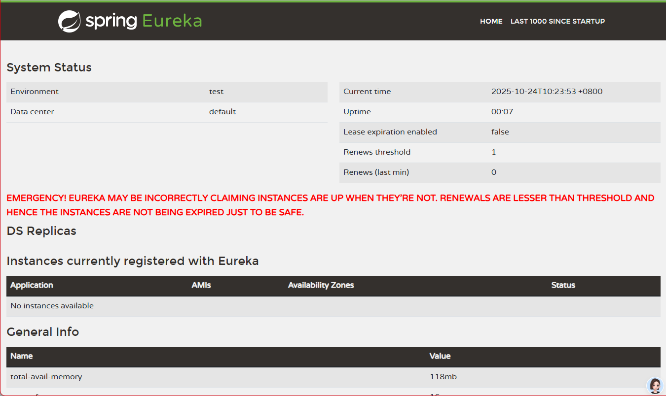 2025-10-23T23:17:37.114+08:00 INFO 23780 --- [ Thread-16] c.n.e.r.PeerAwareInstanceRegistryImpl : Renew threshold is: 1
