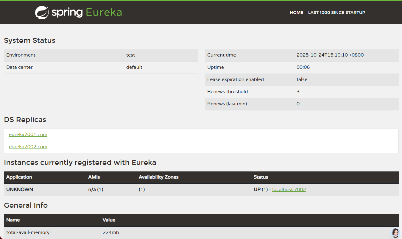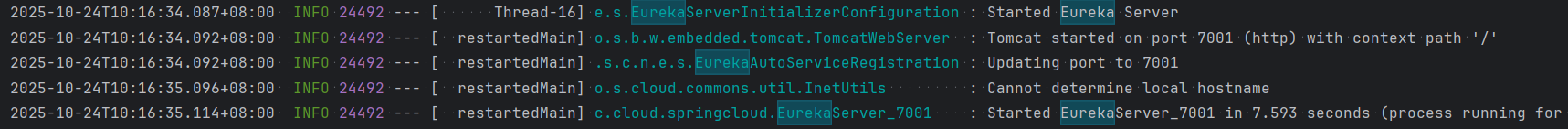 2025-10-23T23:17:38.145+08:00 INFO 23780 --- [ restartedMain] c.cloud.springcloud.EurekaServer_7001 : Started EurekaServer_7001 in 7.24 seconds (process running for 7.928)