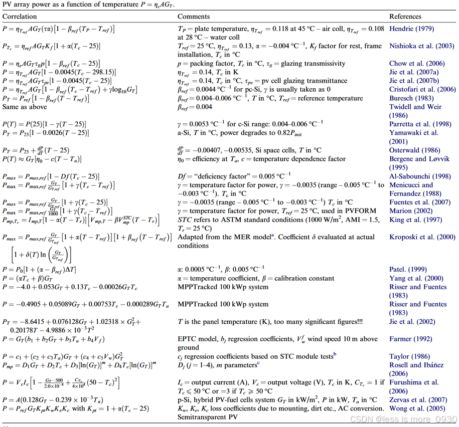 表3列出了文献中发现的光伏发电功率与电池/组件工作温度和基本环境变量之间的一些相关性。其中许多是线性的,而另一些则更为复杂,例如一些非线性多变量回归方程。