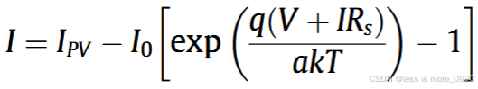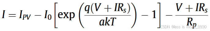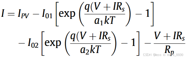 显然,需要考虑如何权衡饱和电流(I02)和第二个二极管的理想因子(a2)这两个新参数。这是在现有的IPV、I01、a1、Rs和Rp 5个参数的基础上增加到7个参数。此外,两个指数项使得保持合理的模拟时间存在巨大的挑战。然而,由于其在低辐照度条件下的优越精度,双二极管模型仍然是一个有吸引力的选择。
