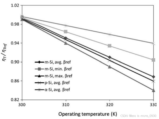 根据表1所列数据,Tref = 25°C,平均href为0.12,平均bref为0.0045°C -1。温度系数对各种硅基光伏组件效率的影响如图8所示,其中Evans-Floschuetz比值hT/hTref是根据工作温度绘制的。