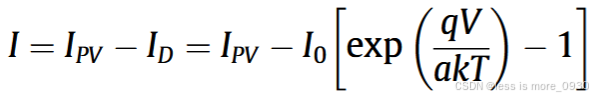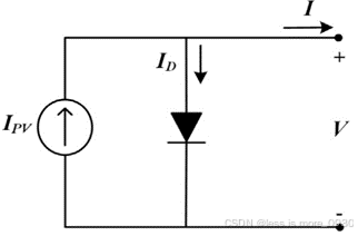 由于辐照的存在,pn结吸收入射光中的光子并产生电子-空穴对(或载流子),在pn结处建立起电位差,电荷载流子开始在外部电路中流动。这种现象被称为光伏效应,由此产生的电流被称为光电流IPV。IPV的大小取决于入射辐照的通量以及半导体材料的吸收能力。将IPV包含到肖特基方程中,形成了对由并联到pn结二极管的电流源组成的照明单元的基本描述。这是理想光伏电池模型,如图2所示。电池的输出电流等于光电流减去二极管电流,表达式为:
