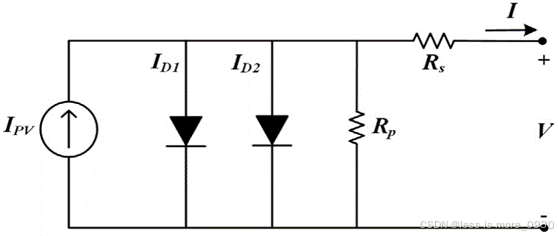 迄今为止所讨论的单二极管模型都忽略了耗尽区复合电流损耗的影响。考虑到这种损耗,特别是在低电压情况下,因此提出了一种更精确的等效方法,称为双二极管模型。模型如图7所示。其输出电流表达式为: