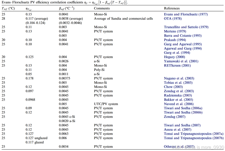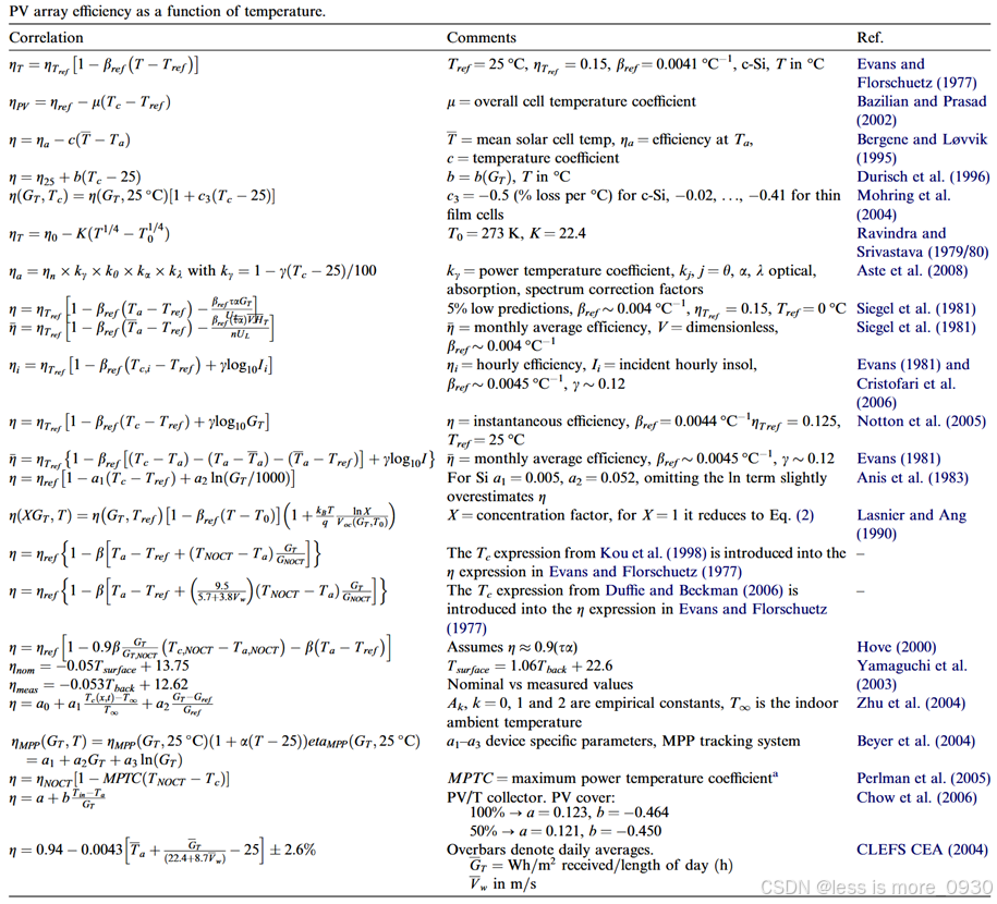 汇总文献中的光伏电池/组件效率的一些方程如表1和表2所示。第一个表包含许多与温度成线性关系的电效率表达式的参数值,第二个表提供了hc的附加形式,包括每个相关性的相关注释。