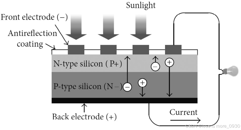 在进行光伏电池的建模之前,需要了解光伏电池的基本结构及其与入射光的关系。光伏能量转换需要通过内部电场将电子和空穴分离,典型硅光伏电池的简化结构如图1所示。为了减少入射辐照的阻碍,电极的上侧采用薄而不连续的结构,手指状的金属元件嵌入到硅中。它的大小和形状的设计,以最大限度地吸收表面光照和减少接触阻力。