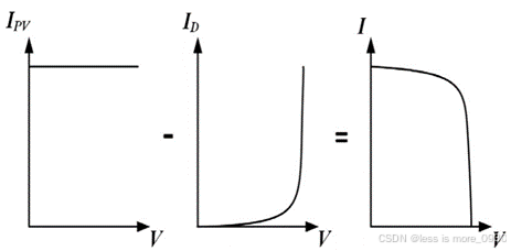 由上式可知,该模型需要三个参数,即光电流(IPV)、饱和电流(I0)和理想因数(a)来充分表征I-V特性曲线。还可以注意到,I是IPV和ID的叠加,如图3所示。IPV决定了曲线的垂直平移,而ID定义了曲线的指数形状。