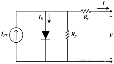 虽然Rs模型比较简单,但当电池经历较大的温度变化时,其精度会有所下降。这是因为该模型确实需要考虑电压VOC和温度系数(Kv)的作用。通过加入分流电阻Rp,可以提高温度灵敏度,如图5所示,该模型被称为单二极管Rp模型。另外,Rp的存在对应于pn结的泄漏电流。制造方法的不同,会导致Rp的大小不同。加入电阻Rp后,输出电流表达式为: