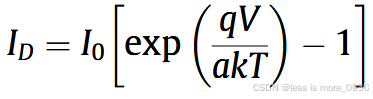 式中,I0表示饱和电流;常数q是电子电荷的绝对值(1.60217646*1019 C);V为二极管端电压;a是二极管的理想(或质量)因数;k为玻尔兹曼常数(1.380653*1023 J/K);T为pn结的温度(K);比值kT/q称为热电压(Vt)。
