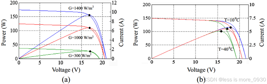 图6 典型的I-V和P-V曲线(a)变太阳辐照度和(b)变温度
