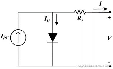 理想的单二极管模型很少被用作光伏模拟器的工作模型,它只是用来解释电池建模的理论概念。为了切合实际,硅和电极表面之间的接触电阻、硅材料中的电流流动电阻和电极的电阻所造成的损耗均需要考虑。表示这些损耗的一种方法是在理想模型中加入一个串联电阻(Rs)。该模型被称为单二极管Rs模型,如图4所示。该模型需要确定IPV、I0、a、Rs四个参数值,参数之间的关系可以表示为: