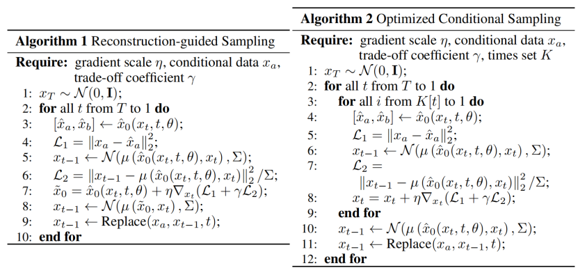 扩散模型的反向过程可划分为早期“创造阶段”和后期“平滑阶段”。论文中提出了重构引导采样算法,如图3中的算法1所示。该算法从完全噪声开始迭代去噪。在每个时间步,它从原始预测的