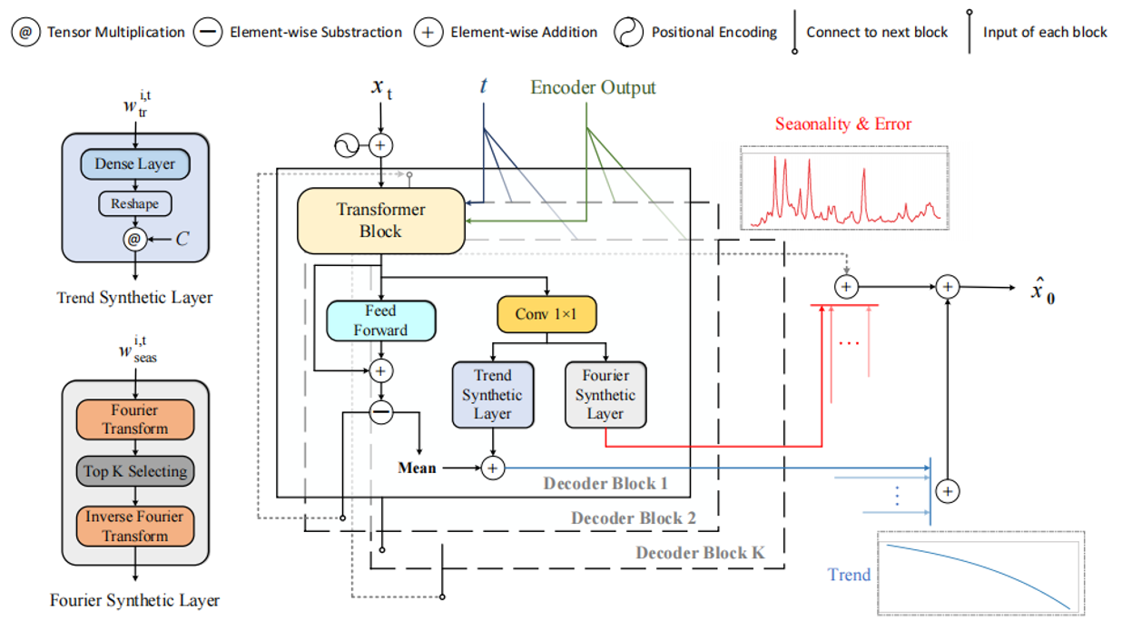 1. 可解释性驱动的架构设计:Diffusion-TS将季节性-趋势分解技术融入扩散模型的去噪网络是一大创新。通过编码器-解码器架构中的趋势合成层与傅里叶合成层,模型能显式学习时间序列的趋势、周期项和残差等成分。这不仅提升了生成质量,其可解释的生成结果(可分解为具体时间模式)还为条件生成提供了语义层面的控制基础。