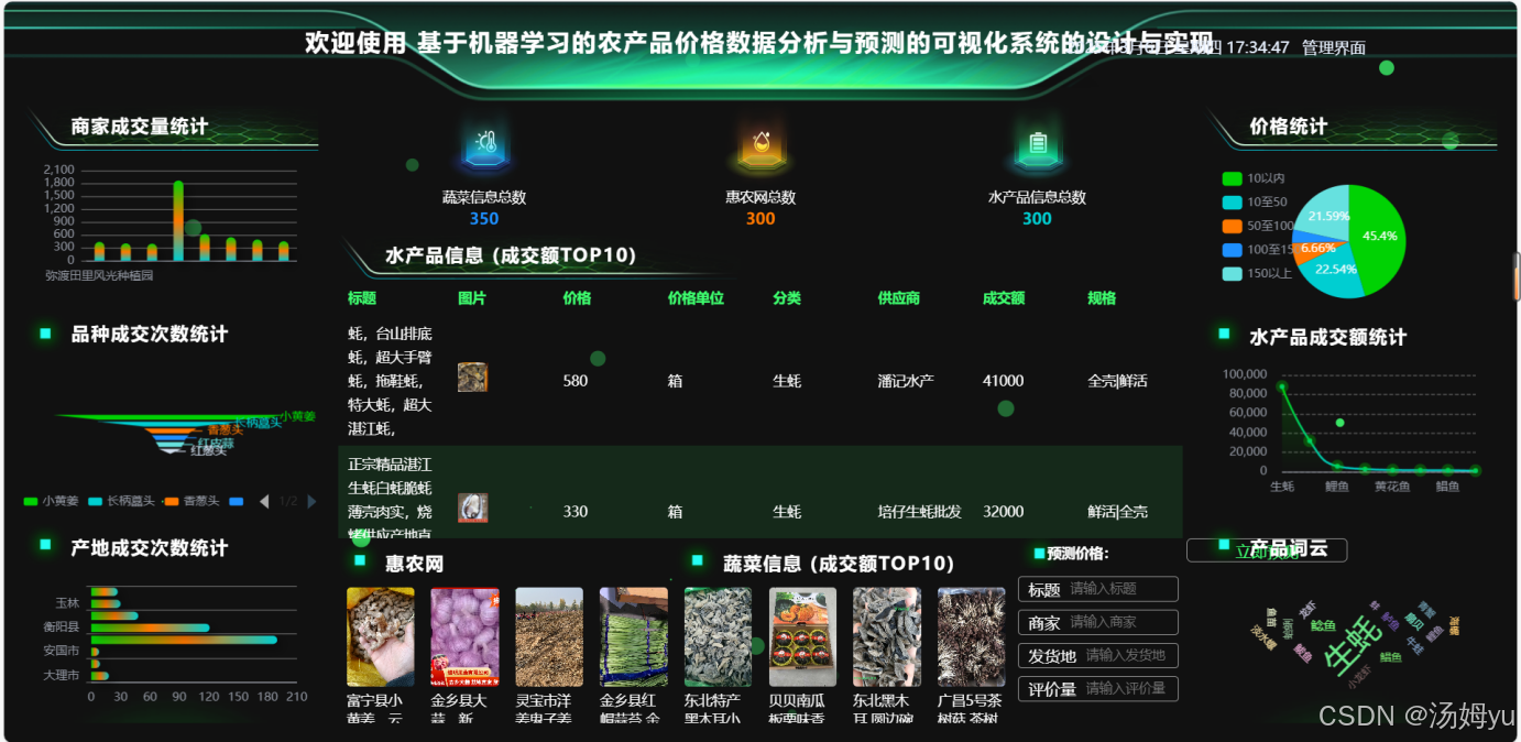 该系统通过整合爬虫技术、机器学习算法和数据可视化工具,能够高效采集和处理农产品价格数据,并提供精准的预测结果。这不仅有助于提升农产品价格预测的科学性和准确性,还能为农业生产者、经销商和消费者提供科学的决策依据。系统通过可视化界面展示价格走势和预测结果,使用户能够直观地了解市场动态,从而优化生产计划、调整销售策略,降低市场风险。该系统还具备数据管理和用户管理功能,能够满足不同用户的需求,推动农业信息化和智能化发展。通过提高农产品价格预测的精度和效率,本研究有望为农业产业的可持续发展提供有力支持,促进农民增收和市场稳定
