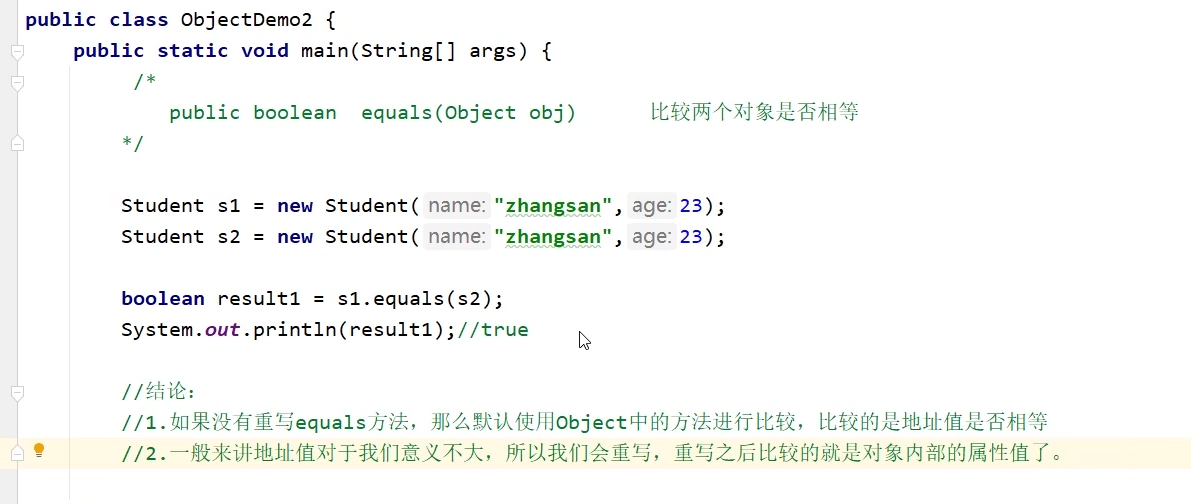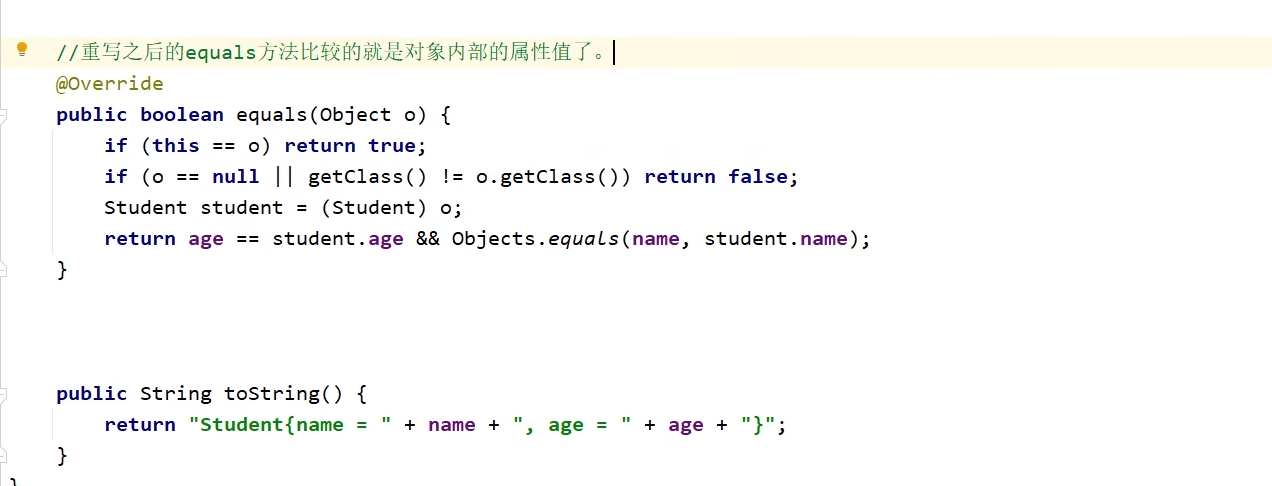 对象名.equals(另一个对象名) ------>>>结果比较的是两个对象的地址值,意义不大!而我们现在想比较两个对象的属性值是否相同,就要对该对象所属的类进行equals方法重写,如下图: