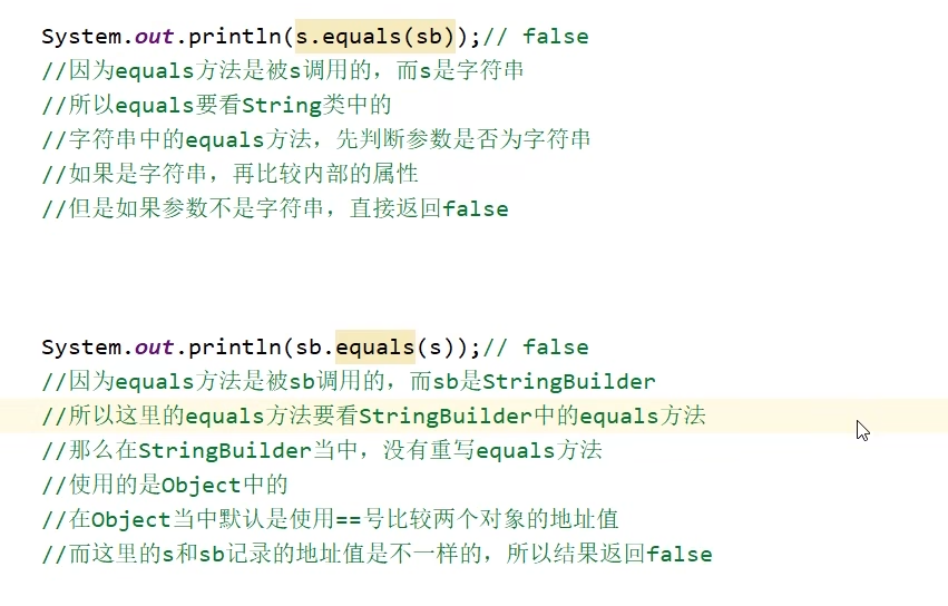 StringBuilder类没有重写object的equals方法,所以还是直接比较地址值。