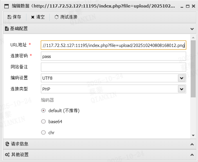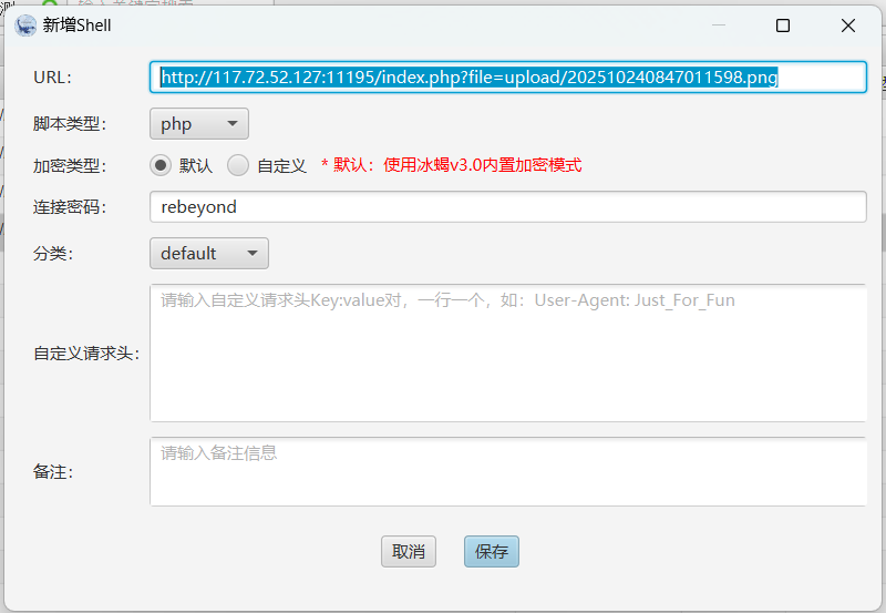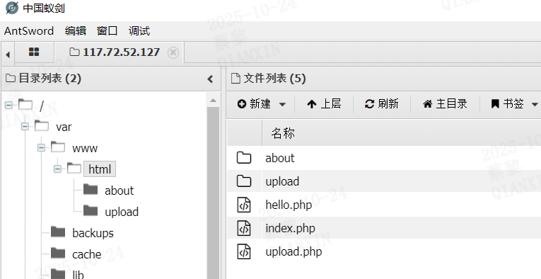 步骤三:(方法一)用菜刀或蚁剑连接,上传一句话木马。