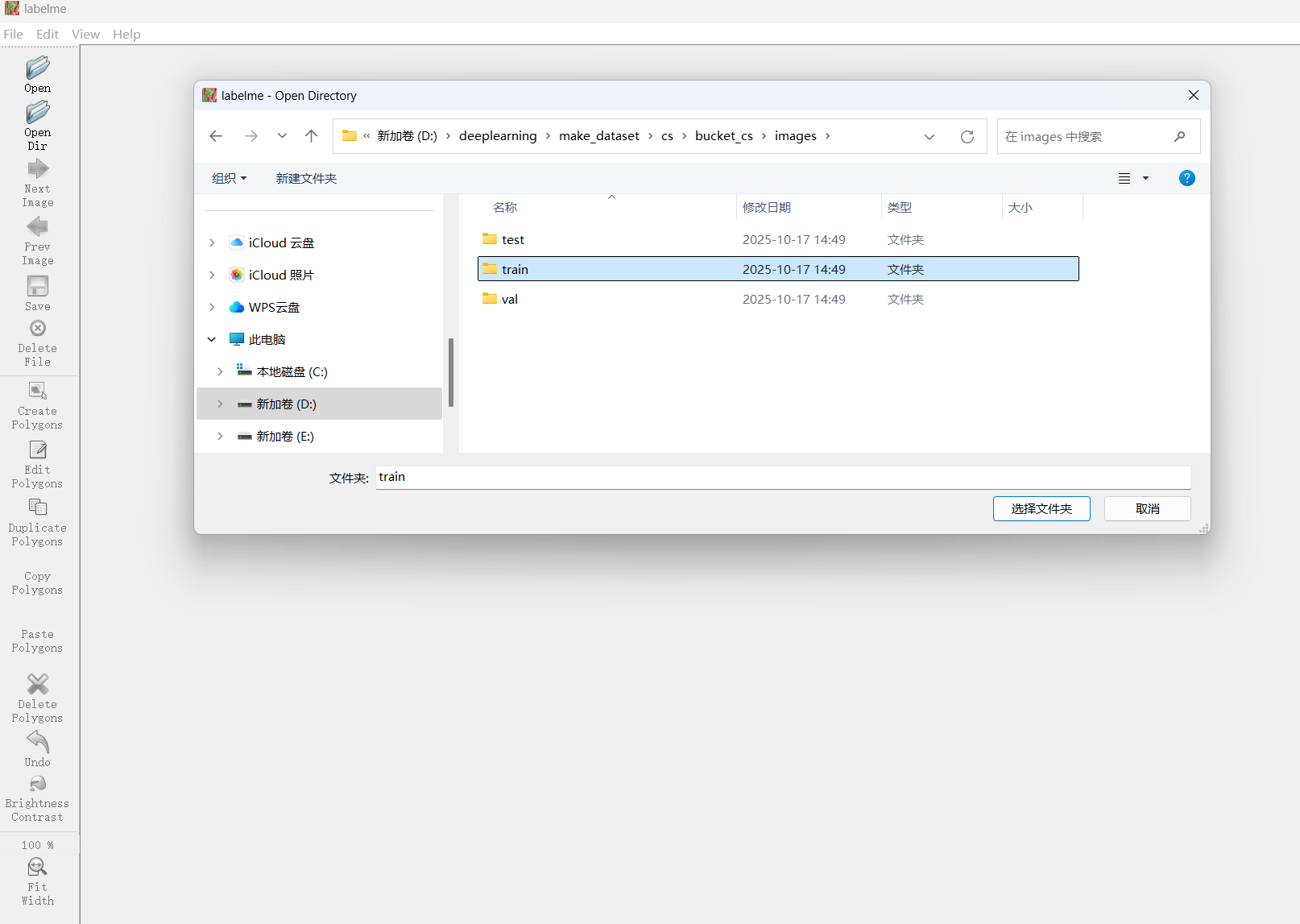 bucket里面填写预测类型。将bucket_cs文件夹复制到D:\deeplearning\ultralytics-8.3.163\datasets下重命名为bucket_cs_seg,至此数据集创建完成。