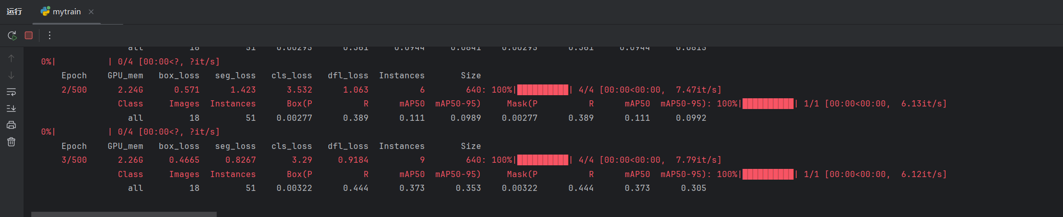 ]if __name__ == '__main__':for m in ms:model = YOLO(m + ".pt")model.train(data=r"bucket_seg.yaml",epochs=500,imgsz=640,batch=-1,workers=1,cache="ram",project="results_bucket_seg_500",name=m,)点击训练,可以看到训练正常进行: