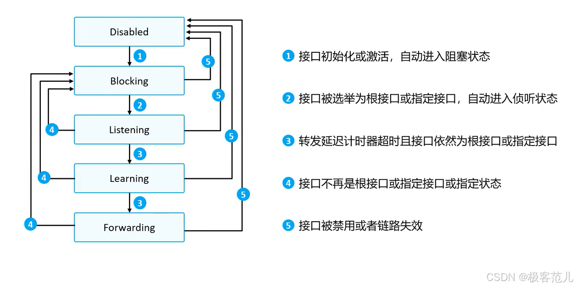 为解决上述问题,STP在定义三种端口角色(根端口、指定端口、阻塞端口)的基础上,进一步引入了五种端口状态机制,分别为:阻塞(Blocking)、侦听(Listening)、学习(Learning)、转发(Forwarding)及禁用(Disabled)。该状态机通过严格控制端口状态的迁移顺序与时序,旨在确保网络在初始构建或拓扑变更后,能够逐步建立无环路的逻辑拓扑,并最终实现网络连通性的稳定恢复。