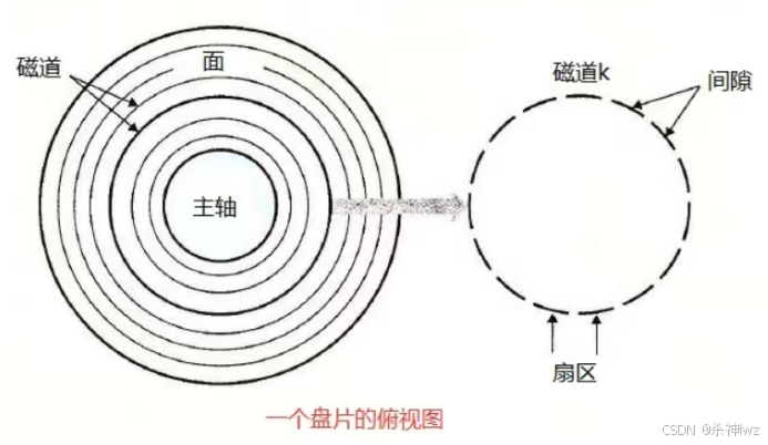 磁盘由盘片构成,每个盘片有两面,又称为盘面 。盘片中央有一个可以旋转的主轴,他使得盘片以固定的旋转速率旋转,通常是5400rpm或者是7200rpm,一个磁盘中包含了多个这样的盘片并封装在一个密封的容器内 。盘片的每个表面是由一组称为磁道同心圆组成的,每个磁道被划分为了一组扇区,每个扇区包含相等数量的数据位,通常是512个子节,扇区之间由一些间隙隔开,这些间隙中不存储数据