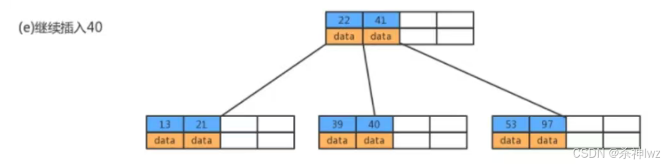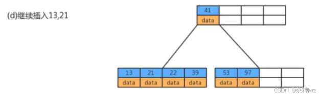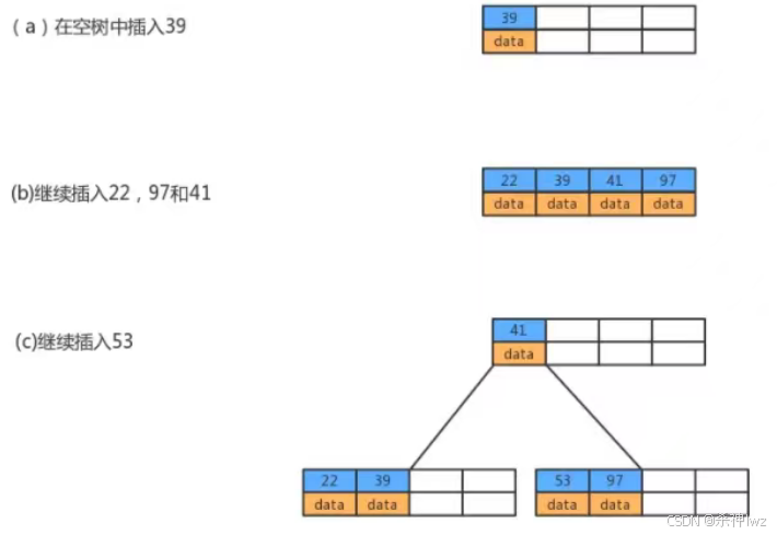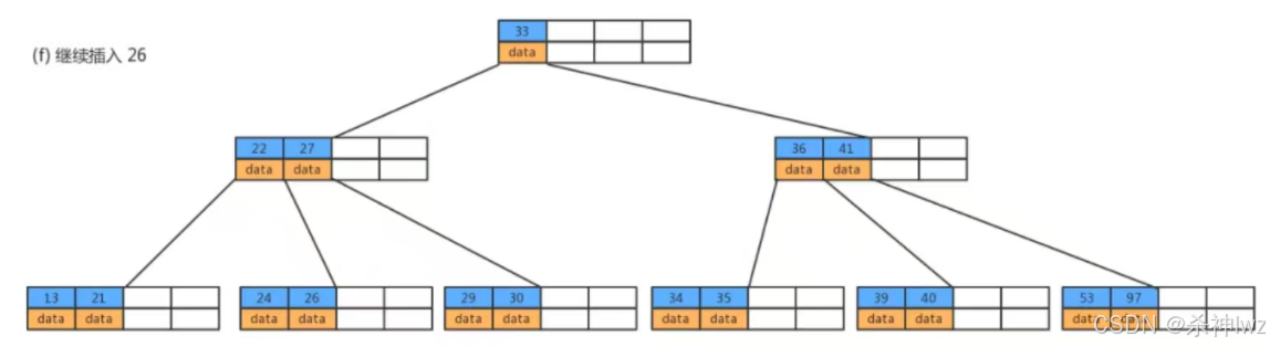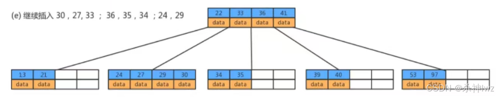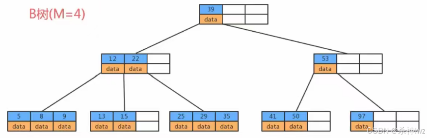 若参数M选择为5,那么每个结点最多包含4个键值对,我们以5阶B树为例,看看B树的数据存储。