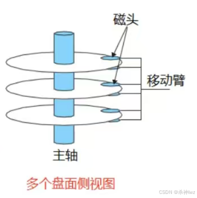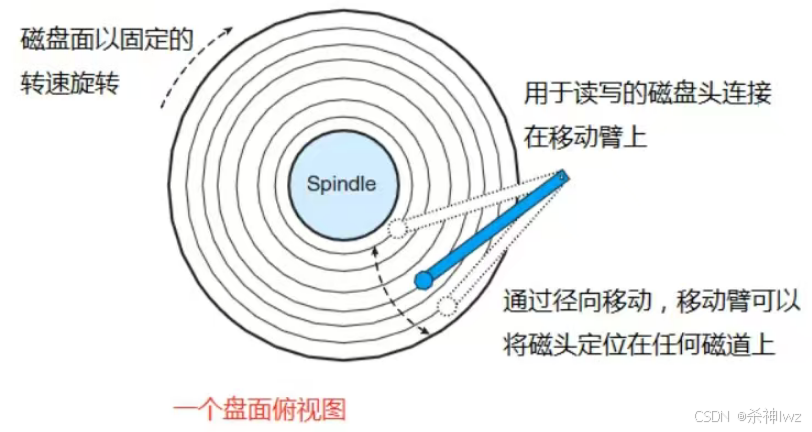 磁盘用磁头来读写存储在盘片表面的位,而磁头连接到一个移动臂上,移动臂沿着盘片半径前后移动,可以将磁头定位到任何磁道上,这称之为寻道操作。一旦定位到磁道后,盘片转动,磁道上的每个位经过磁头时,读写磁头就可以感知到该位的值,也可以修改值。对磁盘的访问时间分为寻道时间,旋转时间,以及传送时间。