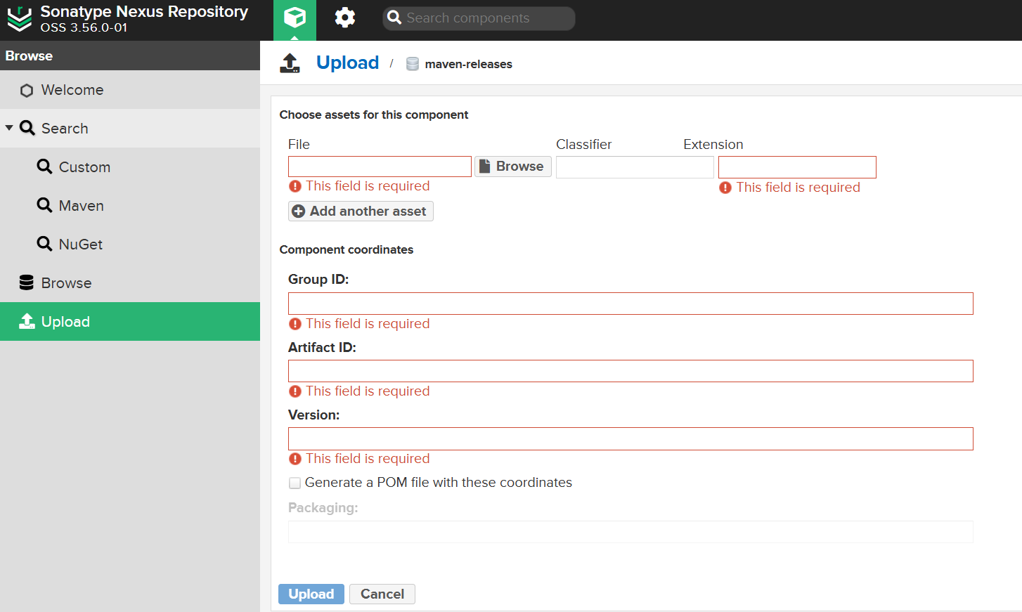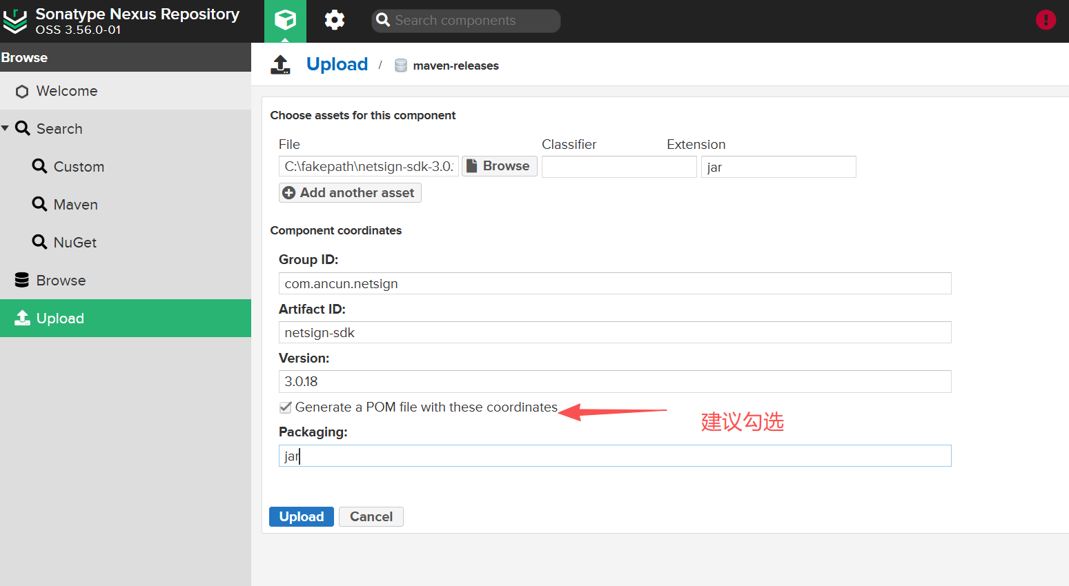 一、选择需要上传的仓库 二、选择jar包填写包对应的groupId、artifactId、version、勾选生成pom文件以及填写packageing 三、上传完成,找到对应的上传目录,确认文件是否存在。
