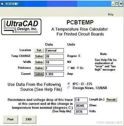 依次填入Location (External/Internal)导线在表面还是在FR-4板内部、Temp 温度(Degree C)、Width线宽(Mil)、Thickness厚度(Oz/Mil),再点Solve即可求出通过的电流,也可以知道通过的电流,求线宽。非常方便。