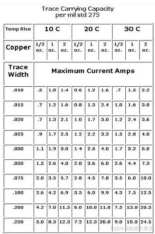 1、在表格数据中所列出的承载值是在常温25度下的最大能够承受的电流承载值,因此在实际设计中还要考虑各种环境、制造工艺、板材工艺、板材质量等等各种因素。所以表格提供只是做为一种参考值。