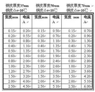不同厚度,不同宽度的铜箔的载流量见下表: