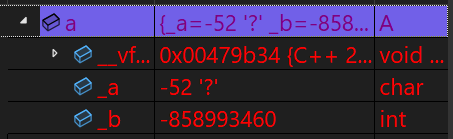 除了_a和_b成员,还多一个__vfptr放在对象的前面(有些平台可能会放到对象的最后面),对象中的这个指针我们叫做虚函数表指针。一个含有虚函数的类中都至少都有一个虚函数表指针。