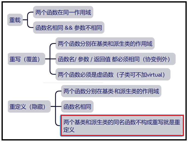 ②重写/覆盖:派生类中有一个跟基类完全相同的虚函数(即函数的返回值类型、函数名字、参数类型与个数完全相同)但函数体实现的行为不同,从而隐藏了基类的版本,称派生类的虚函数重写了基类的虚函数。