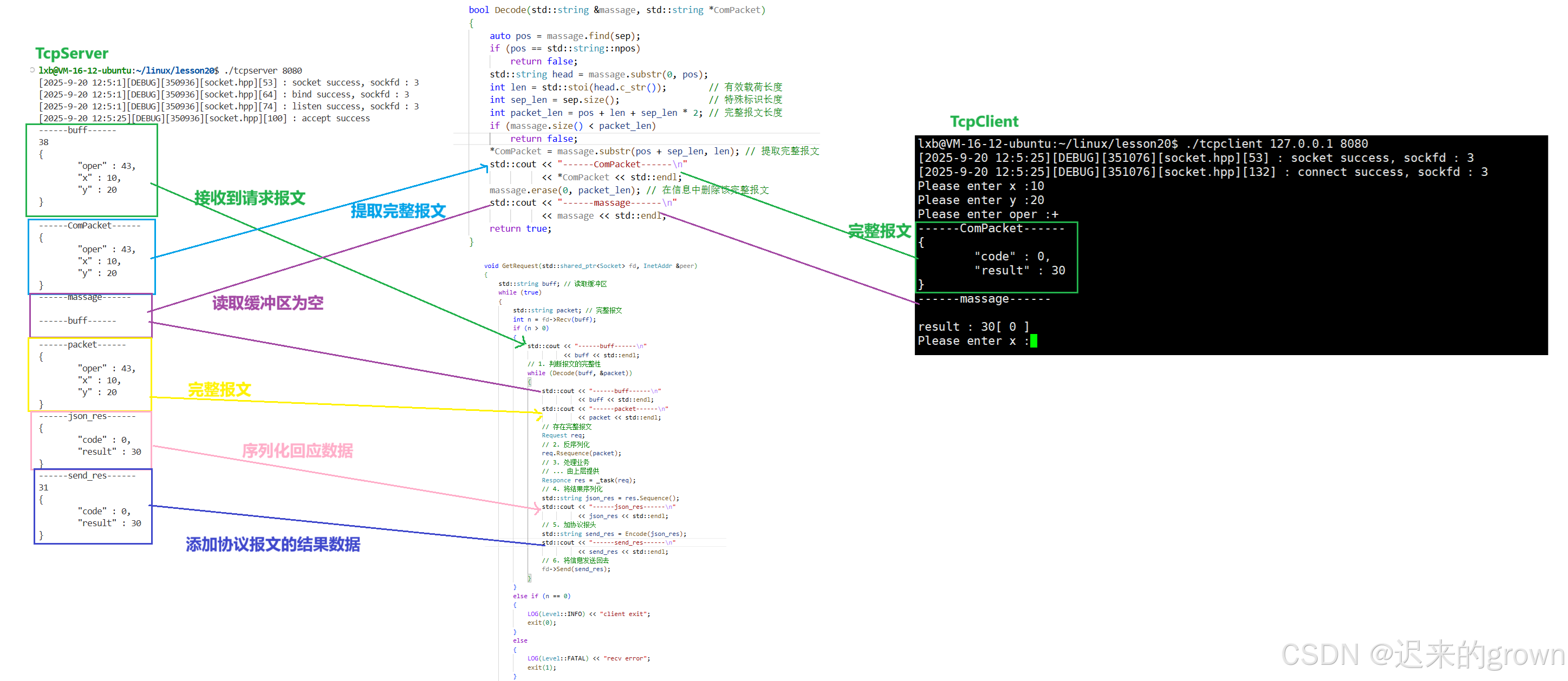 {if (agrc != 3){std::cout << "err usage : " << argv[0] << " server_ip server_port" << std::endl;exit(1);}std::string ip = argv[1];int port = std::stoi(argv[2]);InetAddr server(ip, port);// 创建套接字std::shared_ptr<Socket> sock = std::make_shared<TcpSocket>();sock->CreateTcpClientSocket();// 发送连接请求sock->ConnectOrDie(server);// 创建协议对象std::unique_ptr<Protocol> pro = std::make_unique<Protocol>();std::string buffer; // 接受缓冲区while (true){// 1. 获取数据int x, y;char oper;std::cout << "Please enter x :";std::cin >> x;std::cout << "Please enter y :";std::cin >> y;std::cout << "Please enter oper :";std::cin >> oper;// 2. 构建请求 -> 结构化数据 -> 序列化数据 -> 添加协议报头的数据std::string send_massage = pro->BuildComData(x, y, oper);// 3. 发送请求sock->Send(send_massage);Responce res;if (pro->GetResponce(sock, buffer, &res))res.Show();}return 0;