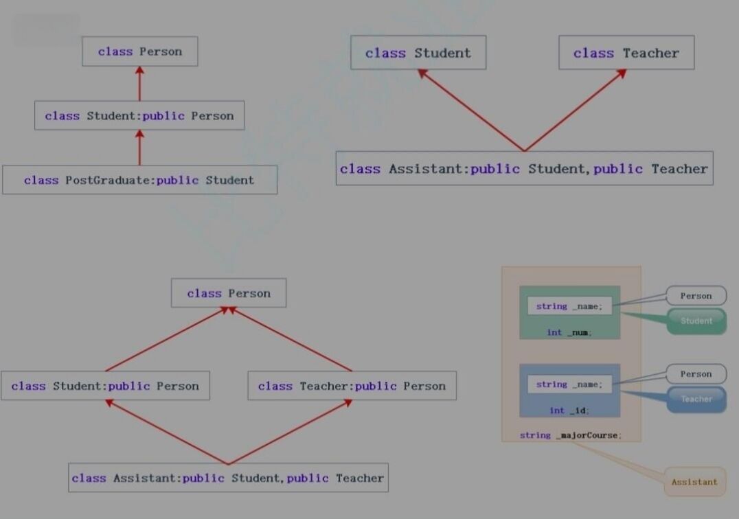 菱形继承:菱形继承是多继承的一种特殊情况。菱形继承的问题是有数据冗余和二义性。在assistant的对象中person成员会有2份,支持多继承就一定会有菱形继承,实践中不建议。
