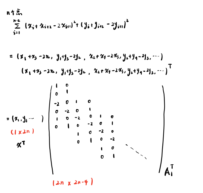 我们有一系列原始路径点 (x_i, y_i),我们希望找到一组新的点 (x_i', y_i'),使得目标函数 J 最小。