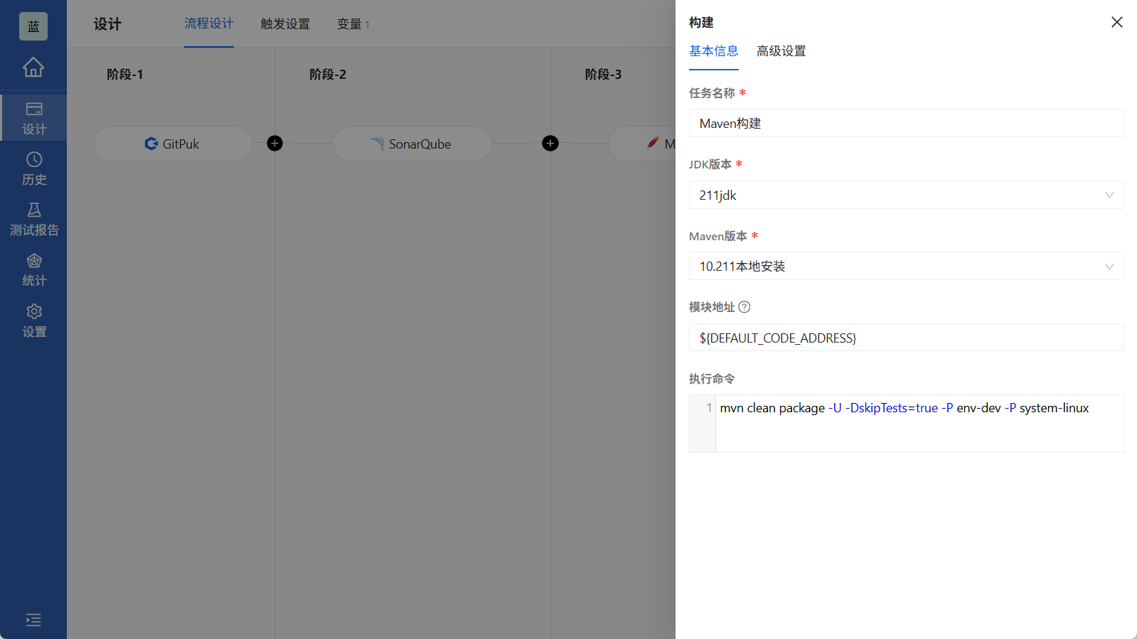 代码扫描添加完毕之后,添加构建安装包任务。根据代码构建方式选择Maven构建,点击新阶段→构建→Maven构建。输入构建信息,输入完成后,点击空白处进行保存。