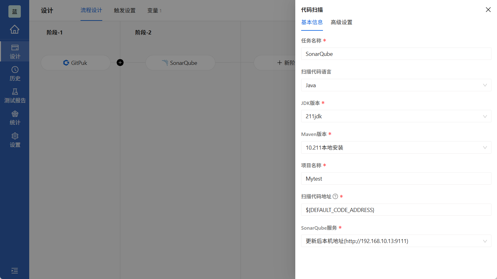 服务集成添加完毕之后,进入流水线设计,点击新阶段→代码扫描→SonarQube代码扫描。添加成功之后,弹出代码扫描的配置。
