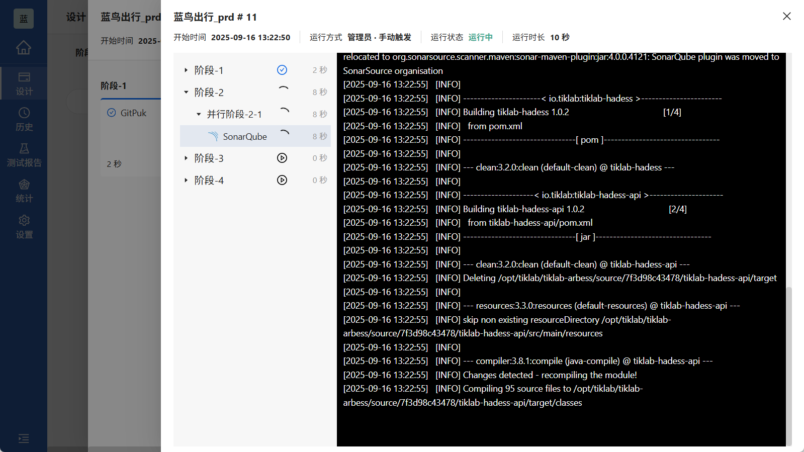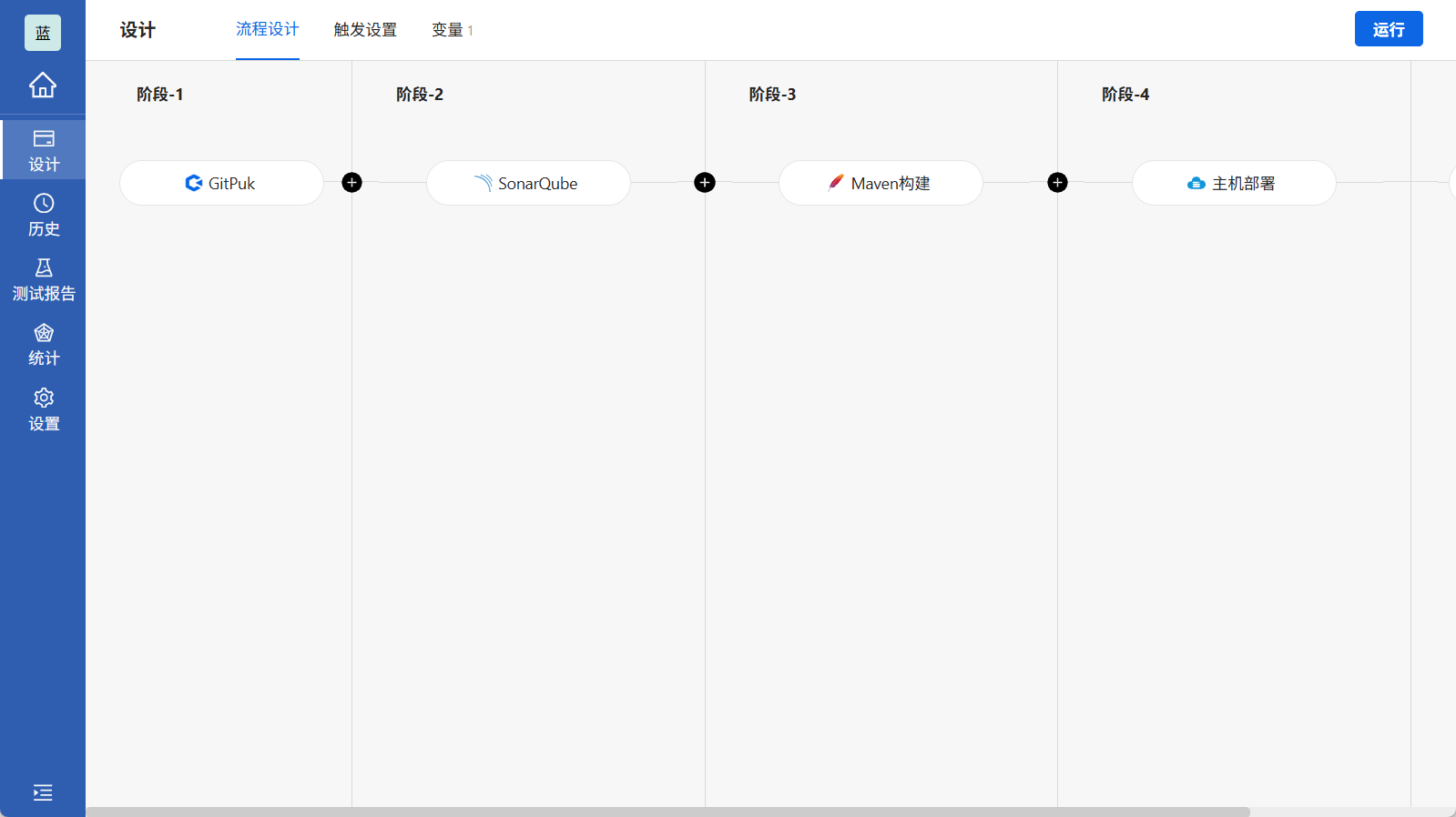 流水线设计完毕之后,Arbess支持自动触发、Webhook触发、手动触发三种运行模式。点击右上角“运行”按钮,手动触发流水线。