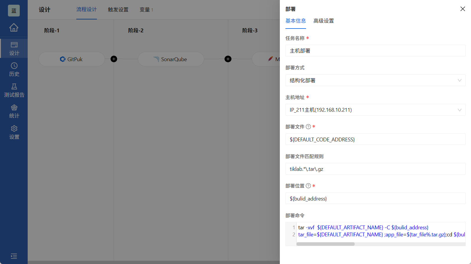 点击新阶段→部署→主机部署。输入部署信息,部署的内容可以使用变量,添加变量后使用${变量名称}进行引用,输入完成后,点击空白处进行保存。