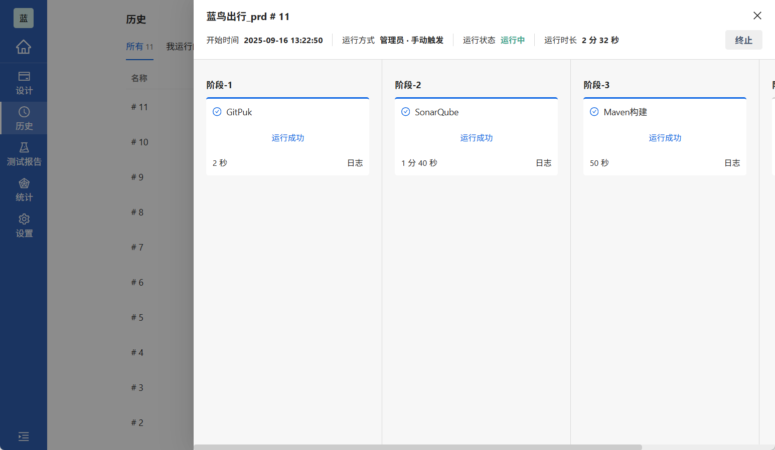可以在Arbess历史页面查看到流水线运行历史。点击运行历史序号,即可查看详细的运行日志。