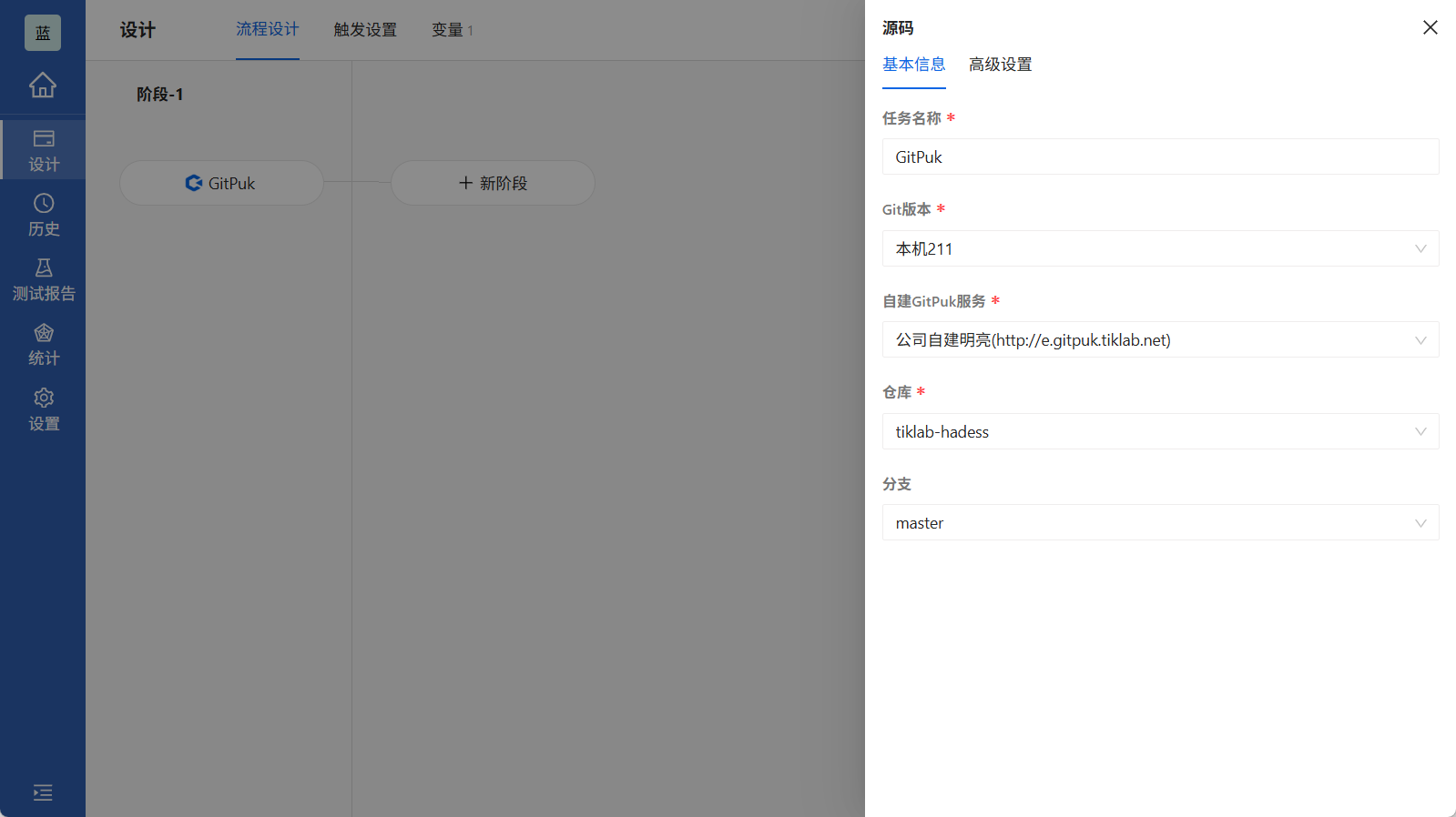服务集成完毕之后,进入流水线设计,点击新阶段→源码→自建GitPuk。