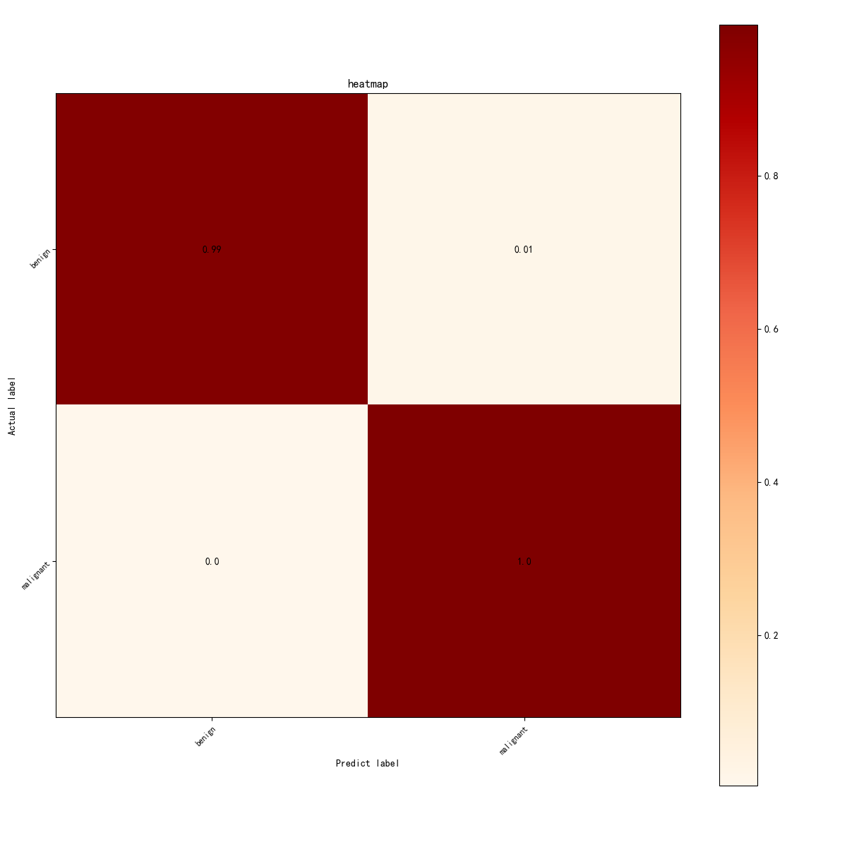 这张混淆矩阵热图展示了基于Swin Transformer模型在乳腺肿瘤分类任务中的表现。图中的左上角显示了模型对良性肿瘤的预测准确率为99%,而右上角的误判率仅为1%,即模型几乎没有错误地将良性肿瘤预测为恶性。左下角的值为0,表明没有发生将实际良性肿瘤误预测为恶性的情况。右下角的值为1.0,显示出模型在预测恶性肿瘤时的完美准确性。这些结果表明,Swin Transformer模型在乳腺肿瘤的分类中表现出色,具有较高的准确性和较低的误分类率,能够有效地帮助实现精准的肿瘤分类。
