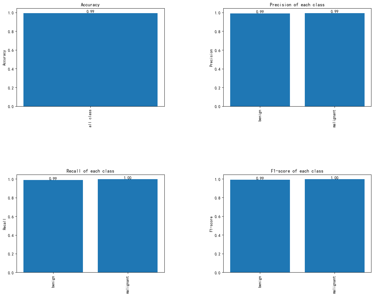 这张图展示了基于Swin Transformer模型在乳腺肿瘤分类任务中的评估结果,涵盖了准确率、精确度、召回率和F1分数四个重要指标。整体准确率为0.99,表明模型在所有分类任务中的表现非常优秀。精确度和召回率方面,良性肿瘤的精确度为0.99,召回率为0.99,恶性肿瘤的精确度和召回率分别为0.99和1.00,显示出模型对两类肿瘤的高效区分能力。F1分数分别为0.99和1.00,反映了模型在精确度和召回率之间的良好平衡。总体而言,模型在乳腺肿瘤分类中的表现非常出色,具有较高的准确性和可靠性,为乳腺肿瘤的早期诊断提供了有力的支持。