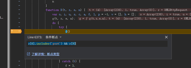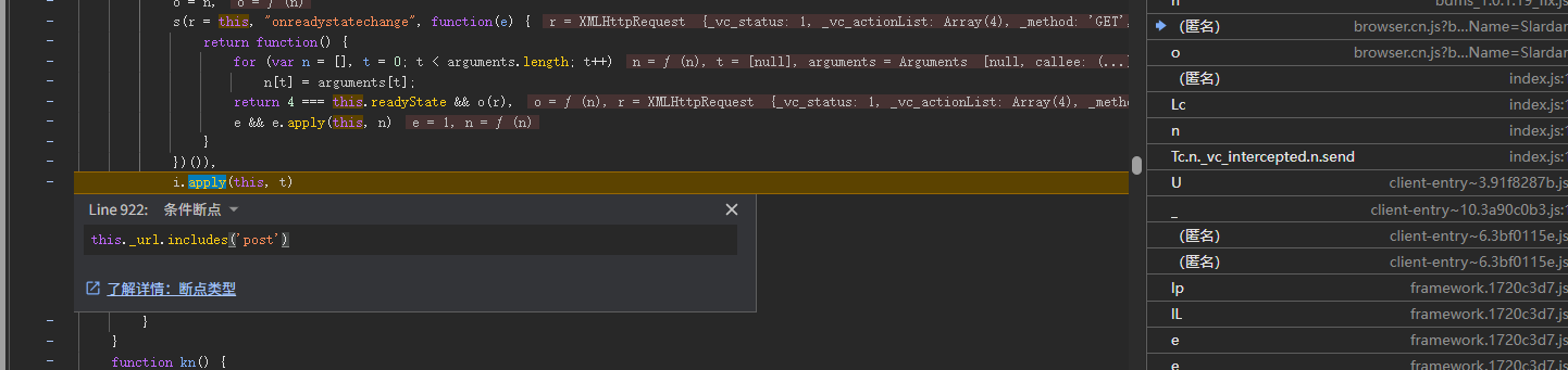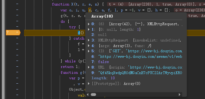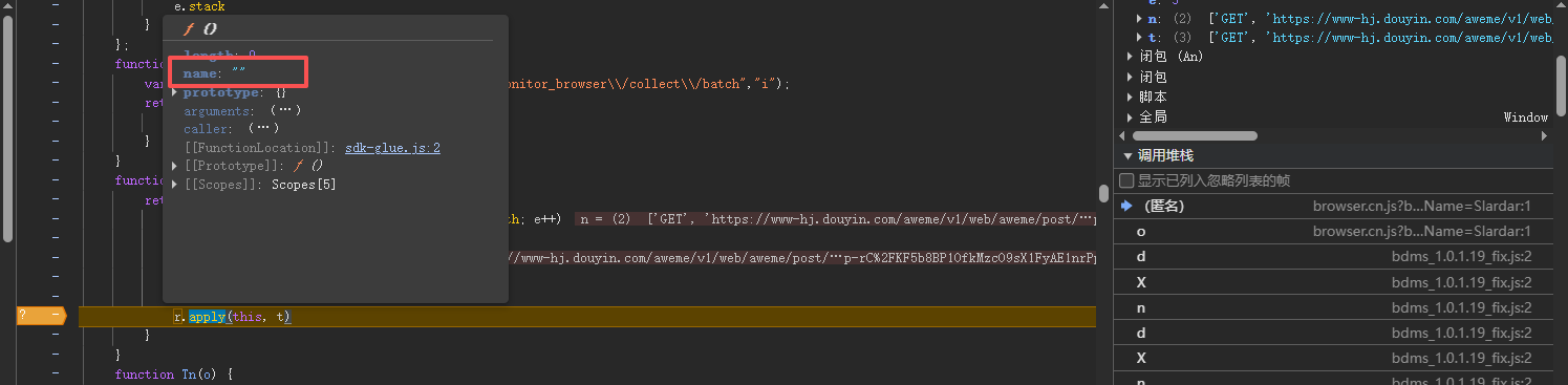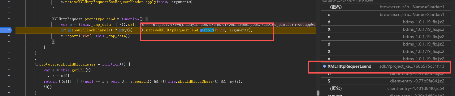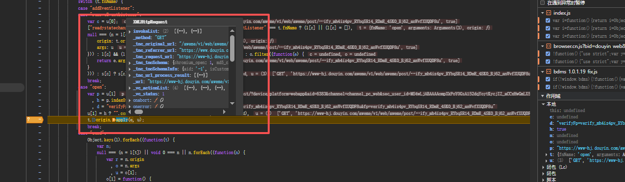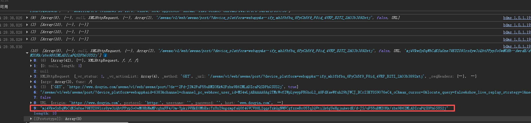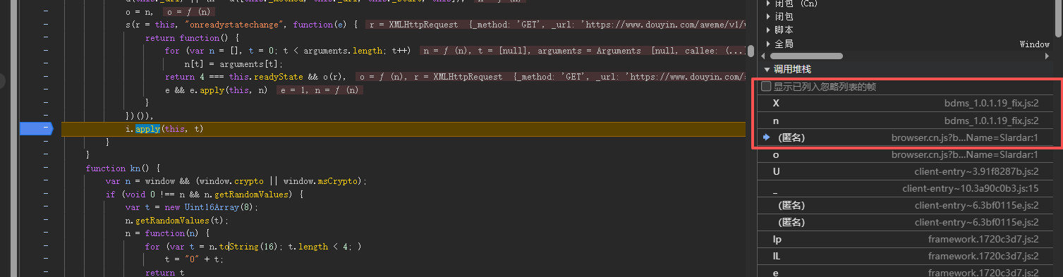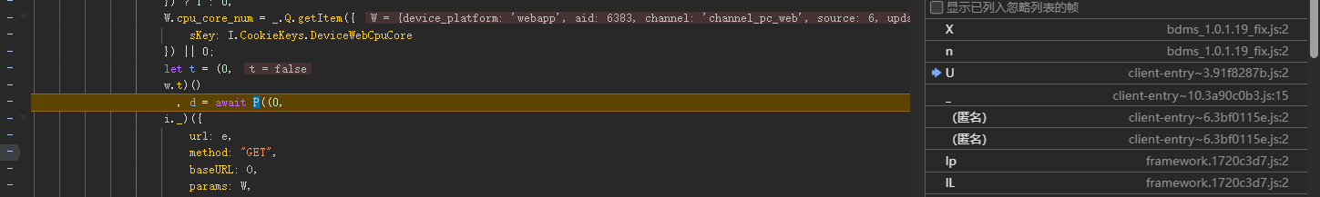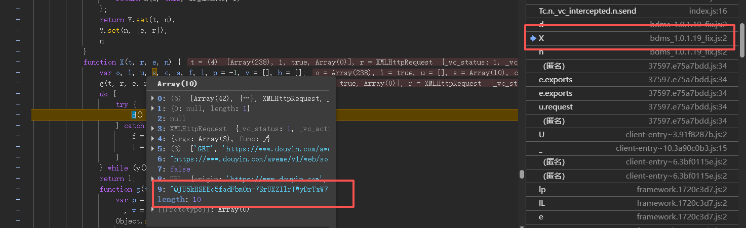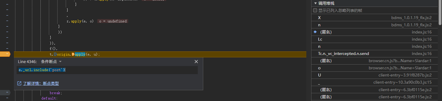 断住后跟栈找,S生成的6坐标对应相应的接口,生成的9坐标则是对应相应接口加密的a_babogus,每个接口的a_bogus值不一样,入口传入参数不一样。所以我们设置添加断点,让它能对应相应接口生成的a_babogus值。