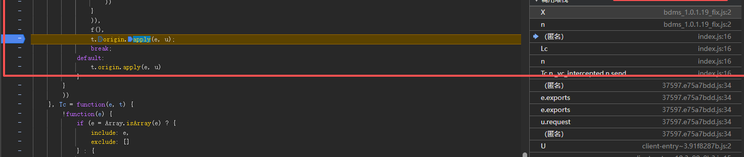 XHR断住后,往每个JS文件入扣处打上断点,经分析,加密位置在bdms.JS文件里,并且每次加载进入bdms.JS文件不一样,有三处地方(天哪,第一次做调试到奔溃)