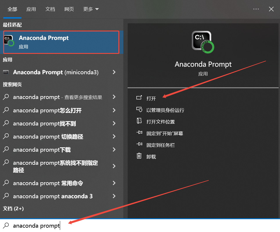 在Windows启动参数中搜索anaconda prompt,找到如下图所示的Anaconda Prompt程序后点击打开