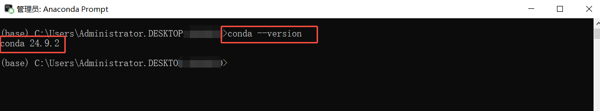 之后会弹出一个Anaconda的命令行窗口,在其中执行conda --version命令,如果输出了版本号信息则表明Anaconda已经安装成功,如下图所示