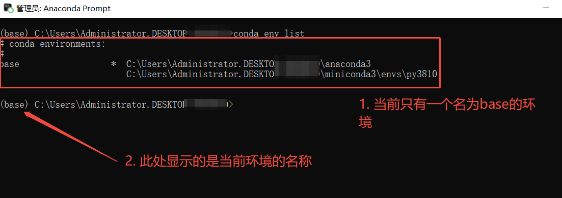打开Anaconda Prompt窗口,可以看到当前默认处于base环境下,执行conda env list命令可以查看当前创建了哪些环境