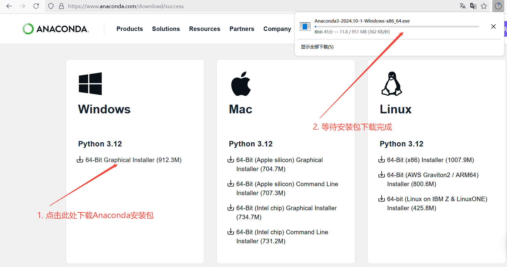 在浏览器中访问网址https://www.anaconda.com/download/success,点击如下图所示的按钮下载Anaconda安装